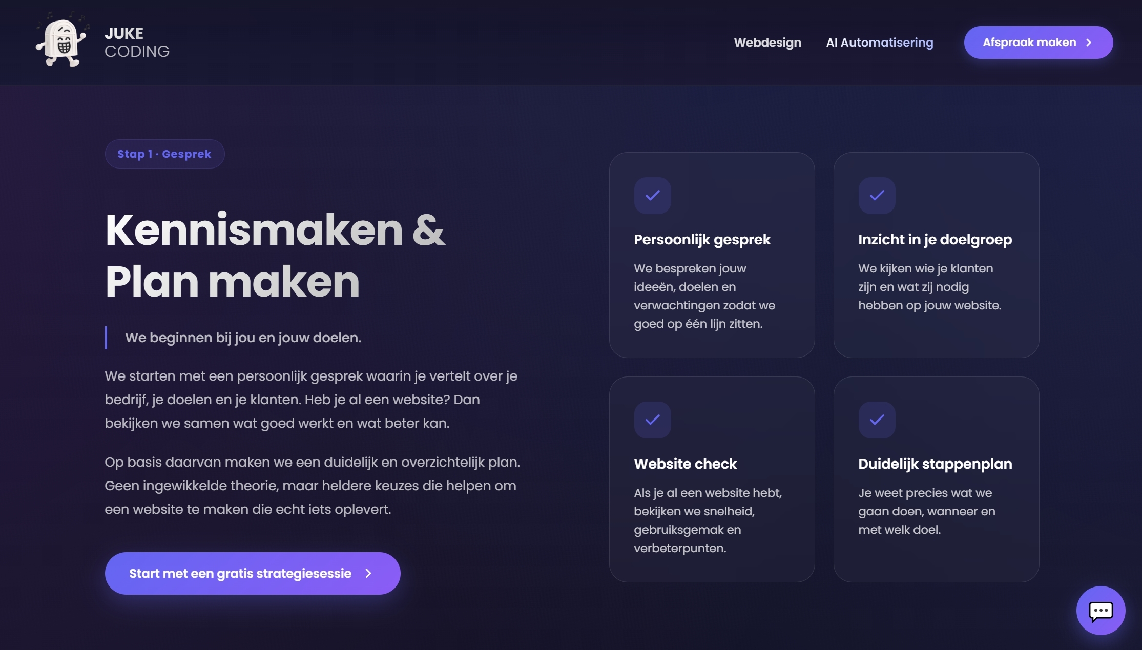 We starten met een persoonlijk gesprek over je bedrijf, je aanbod en je ideale klant. Heb je al een website? Dan bekijken we wat goed werkt en waar bezoekers afhaken.